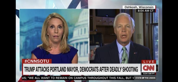 Dana Bash asked Johnson if he was comfortable with Donald Trump inflaming tensions further, quoting from Trump's Sunday tweetstorm. Johnson responded by talking over Bash to blame "disdain for police" and calling for "control of the situation" (i.e. MORE police) while saying "We need to encourage calm." Bash again asked the question Johnson tried to sidestep about Trump "agitating and actively encouraging his supporters to go into Portland, which is resulting in some of this violence." Johnson responded: