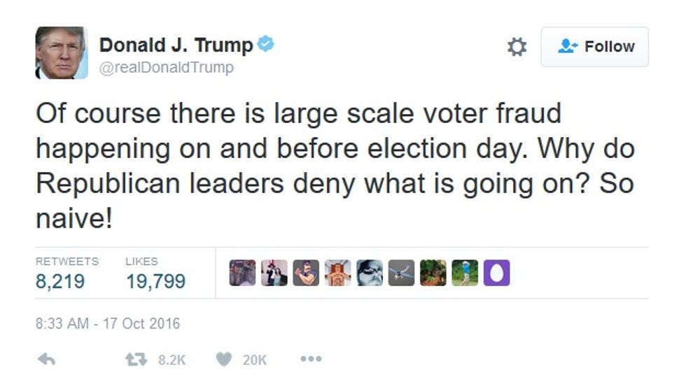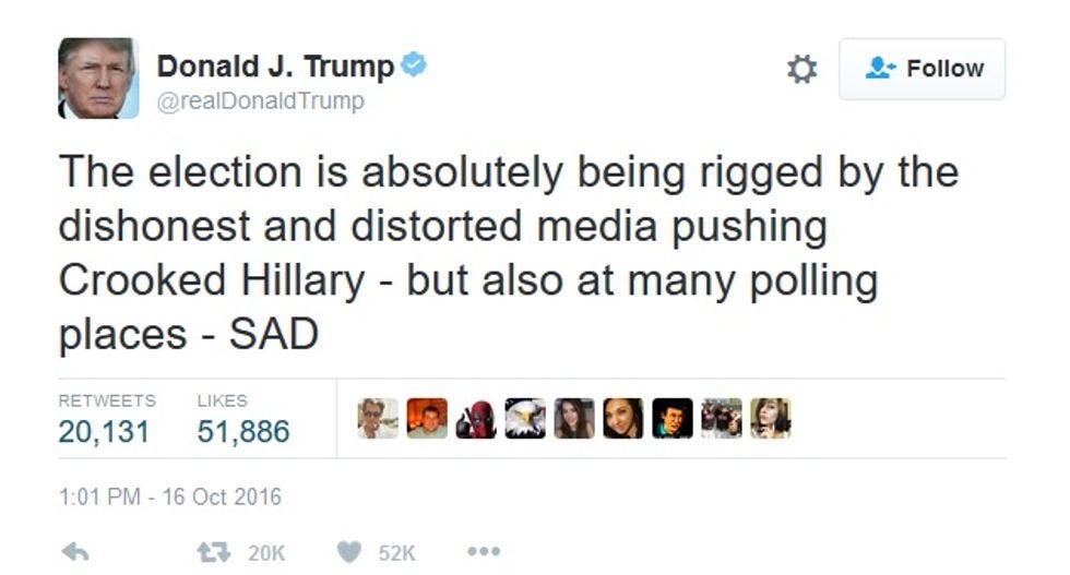 The more Donald Trump keeps nattering on about the rigged elections -- and you know who is doing it, wink-wink -- even Republicans are getting tired of it, because in a whole bunch of swing states, it's actually Republicans who are in charge of running elections and tallying votes, and they for some reason don't like Trump accusing them of being in the tank for Hillary Clinton. As usual, Trump doesn't even seem to be on speaking terms with his vice presidential candidate: Sunday, on NBC's "Meet the Press," Mike Pence reassuringly insisted that he and Trump "will absolutely accept the result of the election.” Then a little while later, Trump himself sent out a tweet suggesting his veep nominee is either a dupe of the crooked media or perhaps a secret Hillary supporter himself: