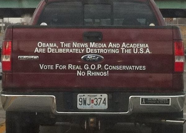 What is ruining America for middle-aged white guys who drive monstrous pickup trucks around the Ozarks thanks to the oil from Islamofascist dictatorships? Oh, the usual: President Obama, "the news media," and higher education. Also, beware of "rhinos," also.Thanks to Wonkette operative "Will Ferrell."