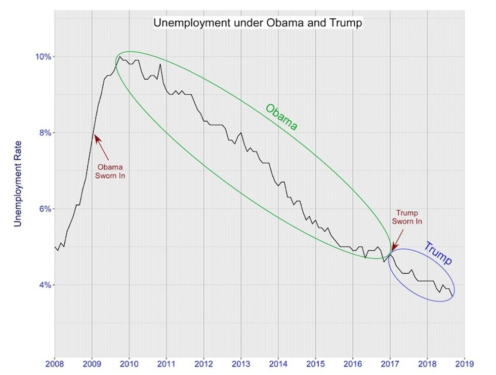If so, that's some seriously shitty rocket fuel, since there's been a steady decline in the unemployment rate since the Obama administration, and the pace of that decline didn't noticeably change after the cuts went into effect. Here, lookie this chart from Forbes in October 2018:
