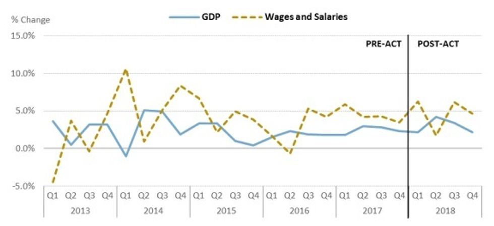 In 2018, gross domestic product (GDP) grew at 2.9%, about the Congressional Budget Office's (CBO's) projected rate published in 2017 before the tax cut. On the whole, the growth effects tend to show a relatively small (if any) first-year effect on the economy. Although growth rates cannot indicate the tax cut's effects on GDP, they tend to rule out very large effects particularly in the short run.