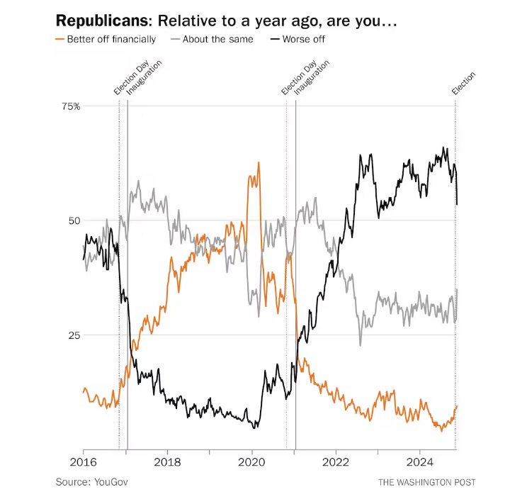 The very tail end of that chart, at the upper right corner, also shows the weird trend over the last month: Following the election, the percentage of Republicans saying they were worse off than a year ago suddenly dips sharply — by 16 points! — and “about the same” jumps higher.