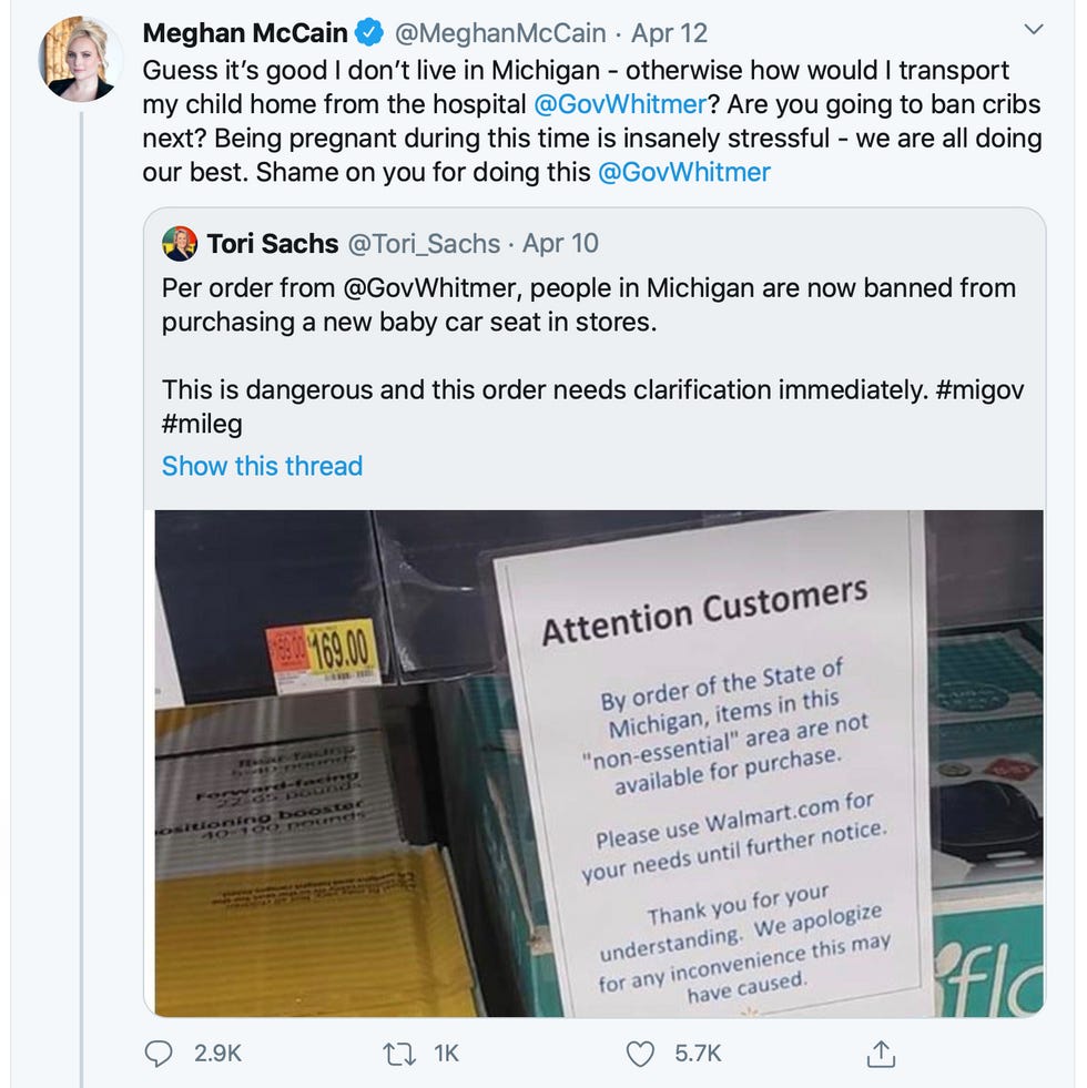 Meghan McCain chimed in on Whitmer's “nonessential" ban because she assumed like a dummy that Whitmer had also banned the sale of children's car seats. Didn't Whitmer know that John McCain's secret daughter would soon have a baby who'd need transporting from the hospital? Shame on you, Gov. Whitmer!