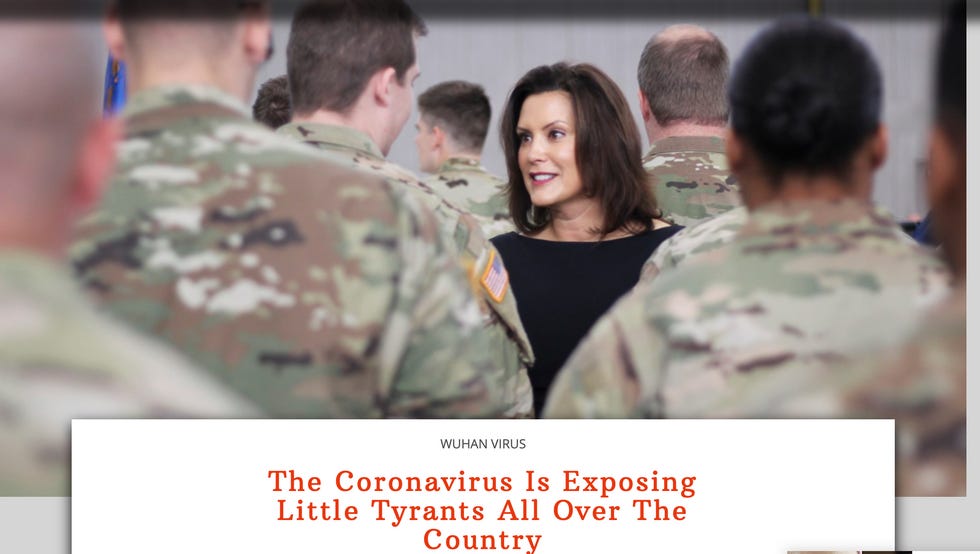 The Federalist argued that the crisis is “exposing little tyrants all over the country." Whitmer is one of several elected officials mentioned in this hysterical diatribe, but she's the only one featured in the photo illustration, which looks like she's giving orders about Death Star maintenance to her stormtroopers.
