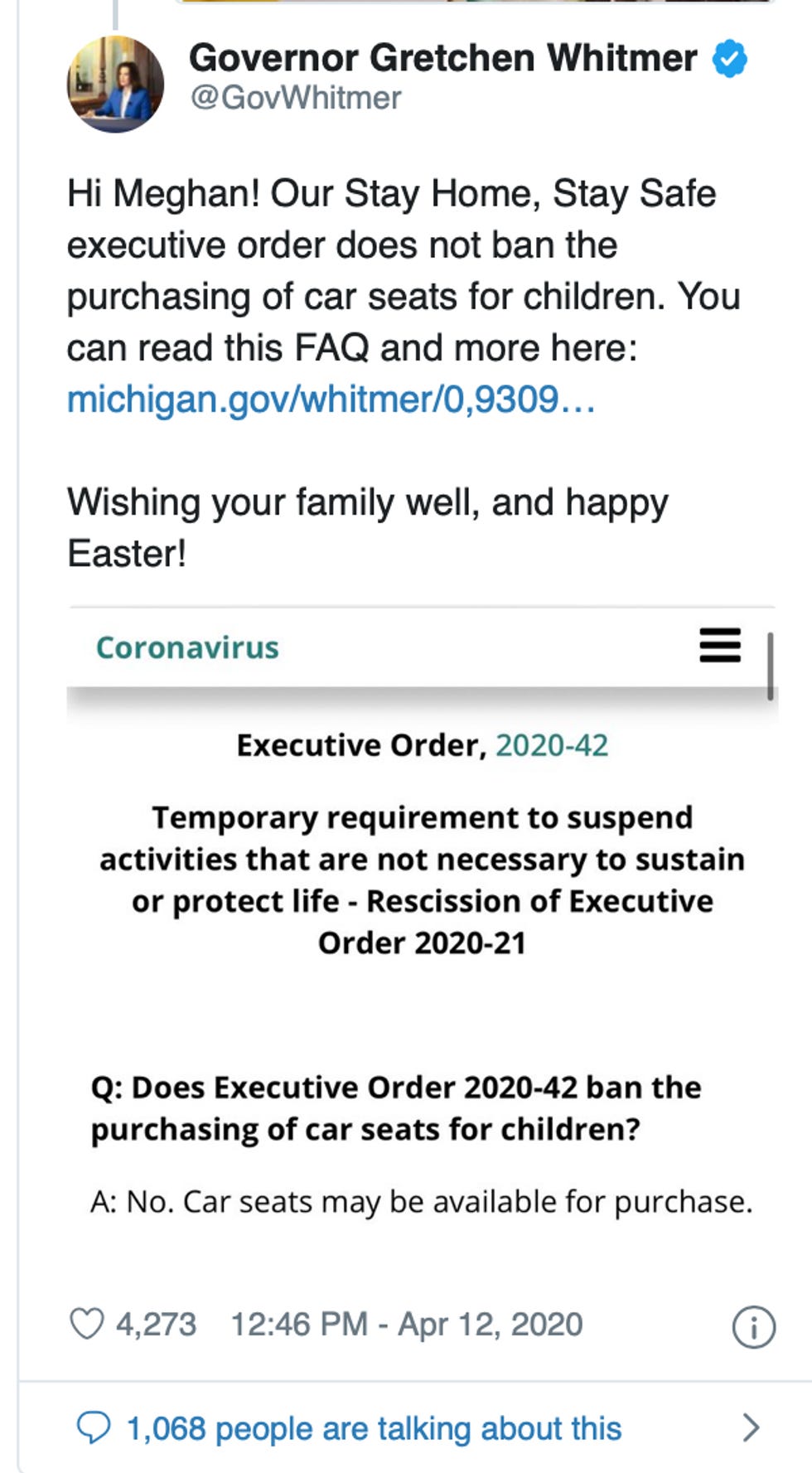 Whitmer responded to McCain with the literal text from her executive order. She even politely recommended that McCain read the order's fucking FAQ.