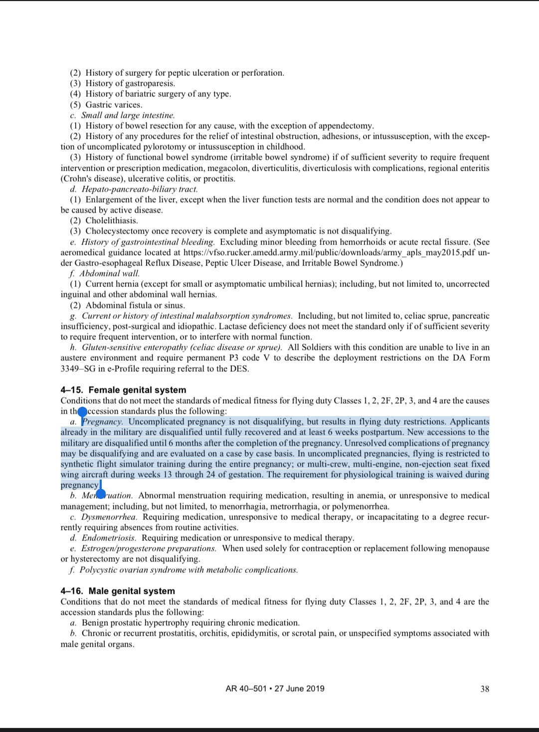 Furthermore, Army Regulation manual 40–501 (Standards of Medical Fitness) states the physical restrictions and accommodations when a soldier is pregnant: