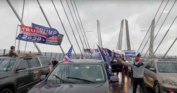 According to Tom Feeney, a spokesman for the New Jersey Turnpike Authority, this demonstration involved “several hundred vehicles." Trump supporters claim they are “peacefully protesting" just like people at a Black Lives Matter rally, but they somehow manage to skirt the law without the cops busting their heads. It's the same white-glove treatment the police gave the (predominately white) anti-lockdown protesters this summer.