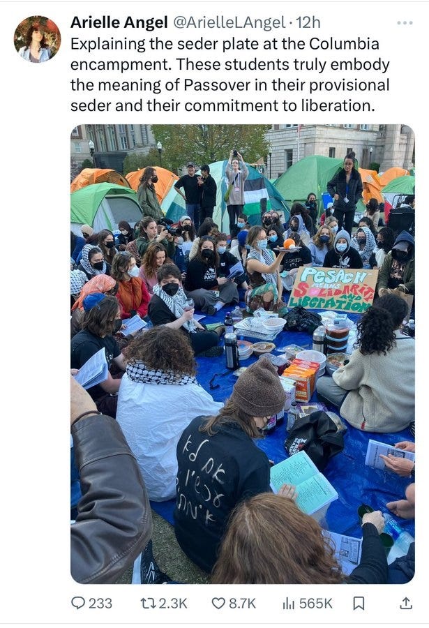 Also, let’s note this tweet from Jewish Currents Editor Arrielle Angel, showing protesters at Columbia holding their own seder with other protesters Monday, to call for peace. Obviously, those kids must be about to engage in a nascent pogrom against themselves.