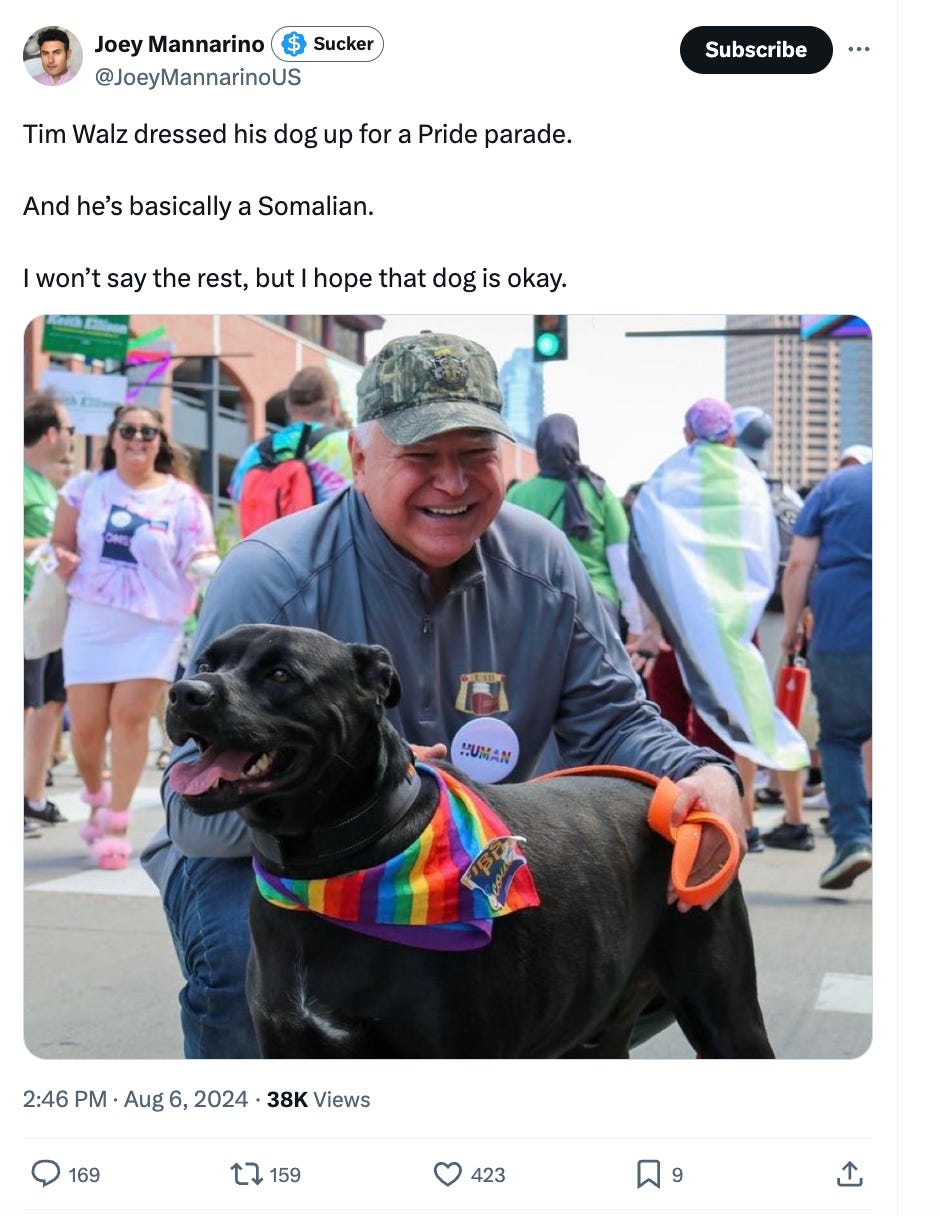 “Tim Walz dressed his dog up for a Pride parade,” he wrote, adding “And he’s basically a Somalian. I won’t say the rest, but I hope that dog is okay.”