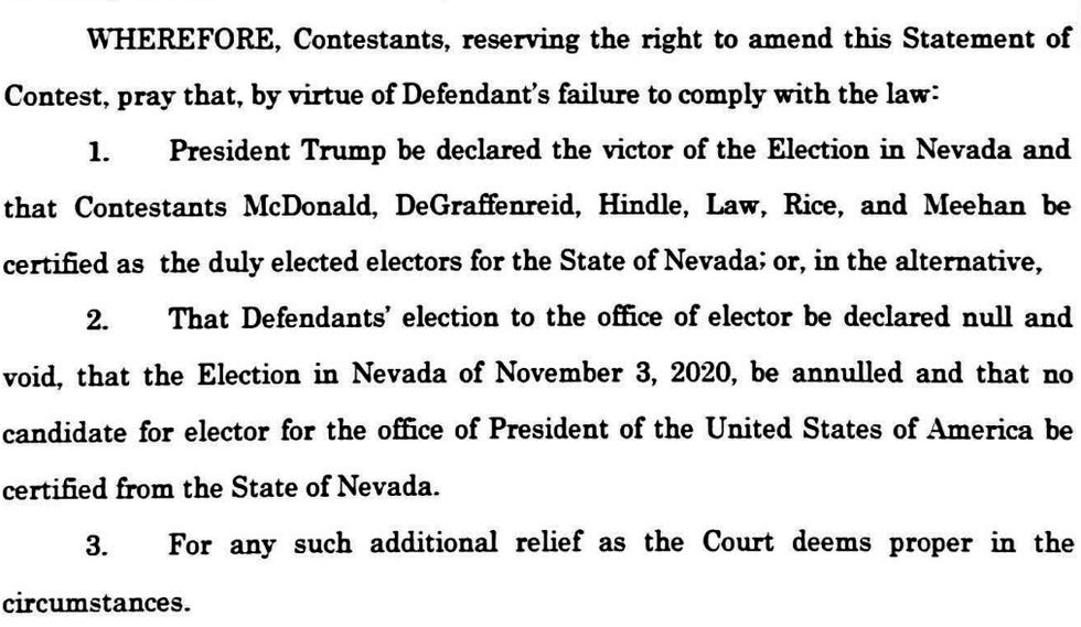 Those plaintiffs are only asking to have the election re-run. But in the other "What Happens In Vegas" lawsuit filed yesterday, the plaintiffs are just asking the court to declare Trump the winner, or, in the alternative, to prevent the certification of a result, so that Nevada fails to cast its six electoral votes.