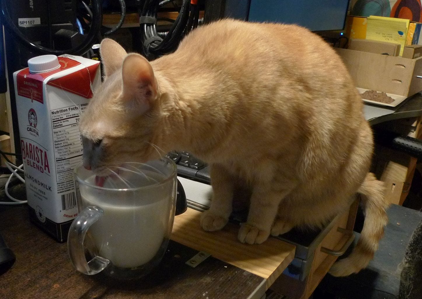 I'm going to bed even though it's only 19:32 MST. Here's a pic of Simba sharing his glass of almond milk with me.