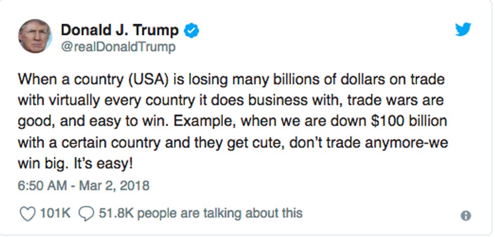 In the latest edition of Every Day Is Like Living In An Episode Of Roots With A Healthy Dose Of Manchurian Candidate And A Dash Of Natural Born Killers Because We Got A Pussy Grabbin' White Supremacist For President, let's talk trade wars! Trump did promise to renegotiate agreements and impose tariffs on the campaign trail, didn't he? Promises kept! But at what cost?