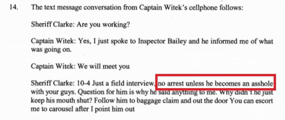 Detroit News reporter Robert Snell breaks down the whole story in his Twitter feed. Passenger Dan Black was met by police and bomb-sniffing dogs after a brief exchange with Clarke on an airplane. Clarke's texts make it clear he called in the cavalry to investigate Black for the crime of disrespecting a man with 30 fake medals pinned to his chest, but later the big, bad sheriff claimed he felt menaced by that scary dude standing over him. The FBI investigation was eventually dropped, and thus it is FAKE NEWS to report that it ever existed.