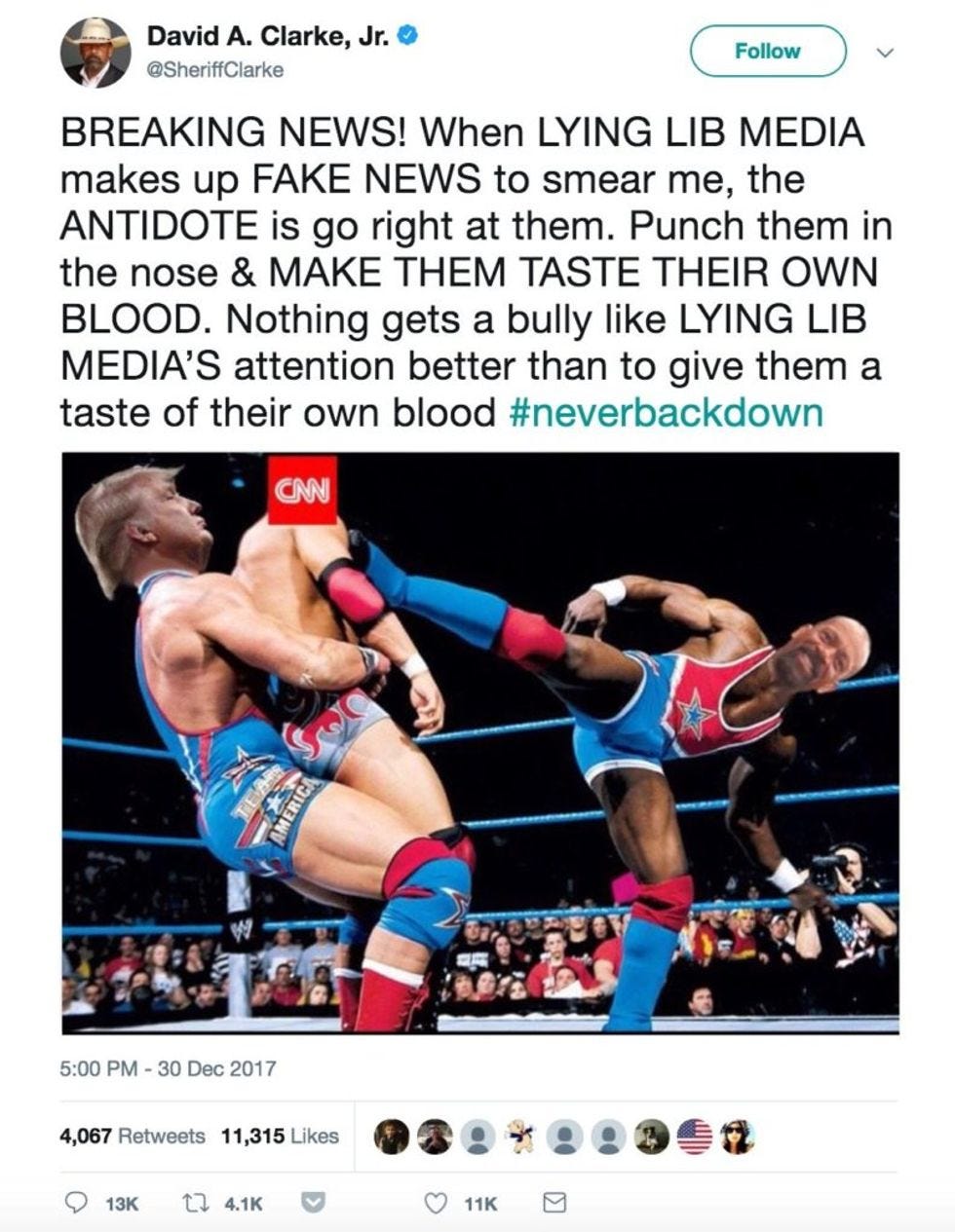 The former Milwaukee sheriff has now deleted this tweet where he instructed his followers to assault members of the press. "Punch them in the nose & MAKE THEM TASTE THEIR OWN BLOOD." But don't go thinking Twitter made him take it down in response to the thousands of reports that he was inciting violence! He just loves to play with those snowflake libs who are triggered by the sight of his swag hats.