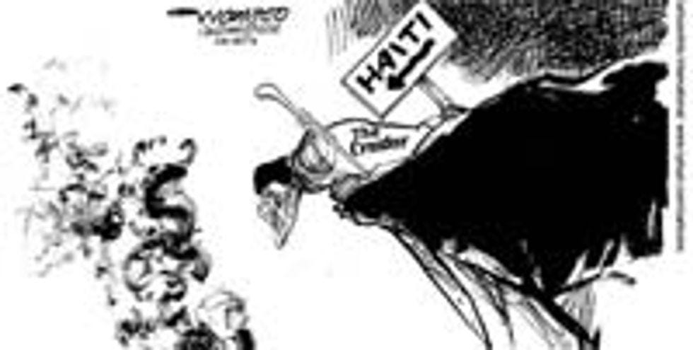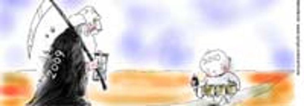 Happy Friday, liberal weenies! Or should I say "suicidally depressing Friday," because all of you are almost certainly suicidally depressed, what with the naked Republican Ted Kennedies and the coming corporate control of all elections and the bankruptcy of your precious liberal radio station ! Anyway, like your liberal weenie foreparents, you will respond to this setback as you have with all others: by sulkily claiming that you're going to move to some more enlightened Foreign country. But of course, you'll never actually do this, because it would be hard, and involve improving on those two years of Spanish you took in high school, but in case you ever get the urge to really, really make the plunge and become an ex-pat, you might want to check on the quality of the Foreigns' political cartoons. They aren't good! Do you really want to be looking at these in your newspaper every day?