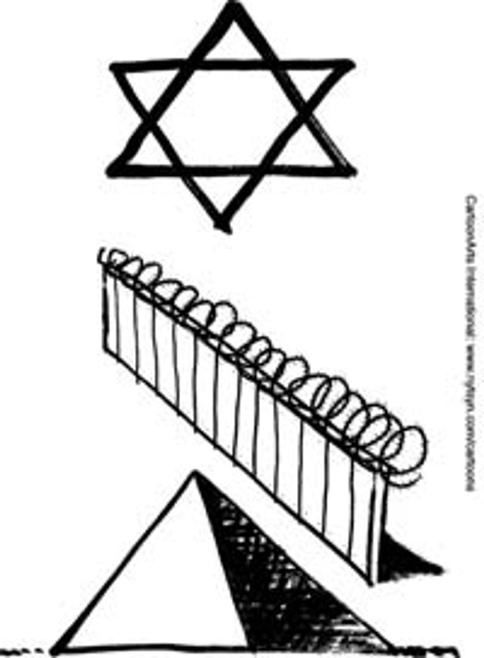 Say, I'll bet our friends "Down Under" (i.e., the descendants of the dregs of Britain's 19th century prisons) have some cogent things to say about the Israeli-Palestinian conflict, in cartoons drawn when they were not at all drunk! See, the caption on this cartoon reads "Israel Builds Wall," and, uh, it's sort of a rebus, I guess! There's the Star of David, which is Israel, and then there's a wall, which is the wall, and then there's a pyramid, which represents "building," because in order to have a pyramid, you have to build it, see. They don't just grow out of the ground, you know! Don't trust those guys who who try to sell you a brick and tell you that it's a "pyramid seed"! It's a scam! Anyway, from the arrangement of these semantic components, we can tell that whatever language they speak in Australia generally has a Subject-Object-Verb word order, and that their writing system is a crude series of ideograms of various levels of abstraction. Also, we learn that the Australians don't keep up with the news much, since the wall in the West Bank has been in progress for something like eight or nine years now.