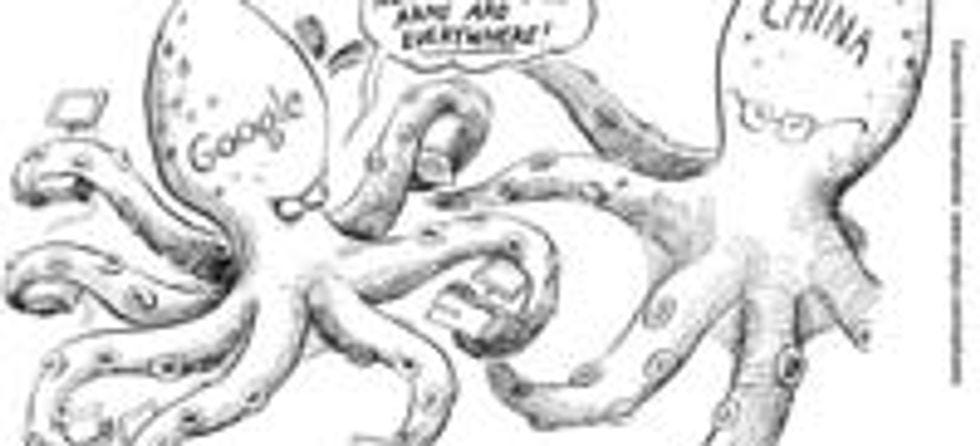 As always, the Germans are much more straightforward in how they express things. They like the erotic feelings they get when watching a cybernetic octopus and an Asian octopus gently and slowly drape their clammy tentacles over each other, in a prelude to mind-blowingly hot cephalo-sex. They look angry at each other now, but that will only make the eventual slimy coupling all the hotter. I can't wait to see the Asian octopus tear off those square glasses with one appendage while using the other seven to sensually caress its lover. Of course, the Germans, ever culturally insensitive, have depicted the Asian half of this mollusktastic fuckfest as China. Silly Krauts, everyone knows that it's the Japanese who are into the tentacle rape!