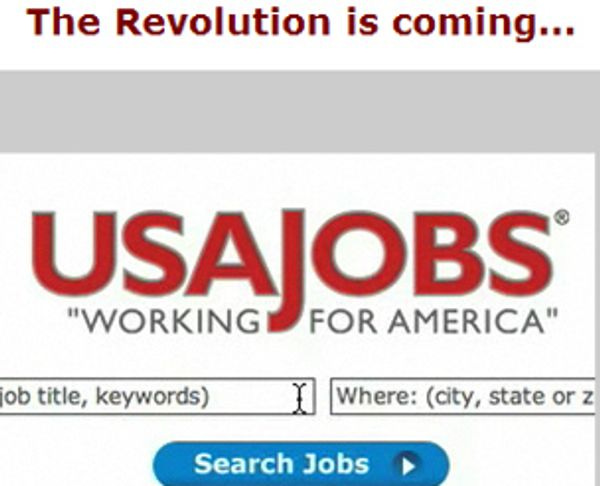 People get ready, there is a Revolution a-comin', on January 23, brothers and sisters of the Socialist Brotherhood (and Sisterhood, we guess?), get up, smash up your seats, shit is gonna getrealRed, oh yeah, oh people get ready, the USAjobs.gov classified-ads system is probably going to have some minor improvements, maybe like that "Monster.com" from 2003 or whatever, rock steady, smash the system (ha ha because you're not getting agovernmentjob, either), and do dig the incredibly lame Casio/MIDI ripoff of Kashmir, because why not, that's the soundtrack to USAjobs.gov.