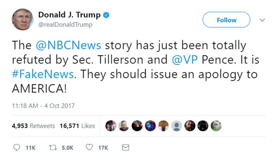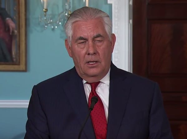 When it was announced that Tillerson would be making impromptu remarks, there was speculation that maybe he would resign. But then Trump kind of threw a bucket of Russian pee on that speculation with this tweet, which suggested he wasn't about to "YOU'RE FIRED!" Tillerson: