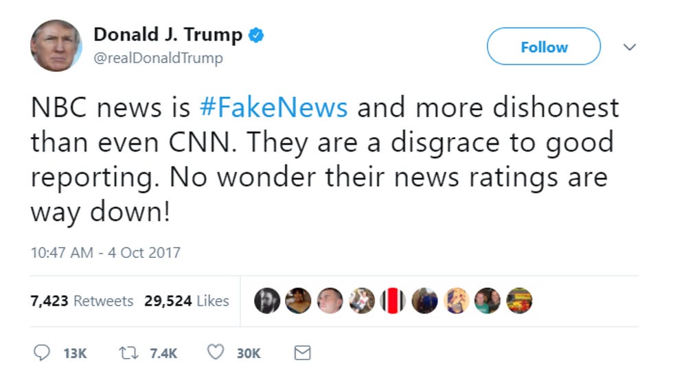 Now, did the Trump White House leak this FAKE NEWS to NBC themselves, maybe because Trump looks like A Idiot right now after his weak and sad performance in Puerto Rico, and now that Trump is getting off AIR-PANE! in Las Vegas to tell grieving mass shooting victims about his Electoral College victory and throw paper towels at their heads? Who can say!