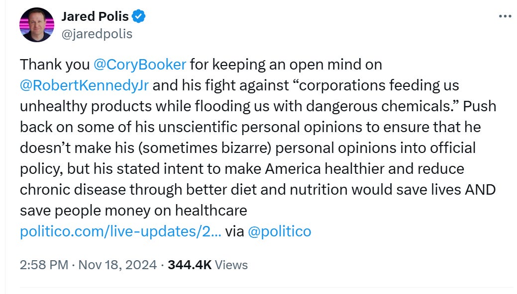 “His (sometimes bizarre) personal opinions”? What do you mean, “sometimes”? All of his personal opinions are bizarre! The one Polis likes about better diet and exercise for Americans is the only not-bizarre RFK Jr. opinion we have rolled across.