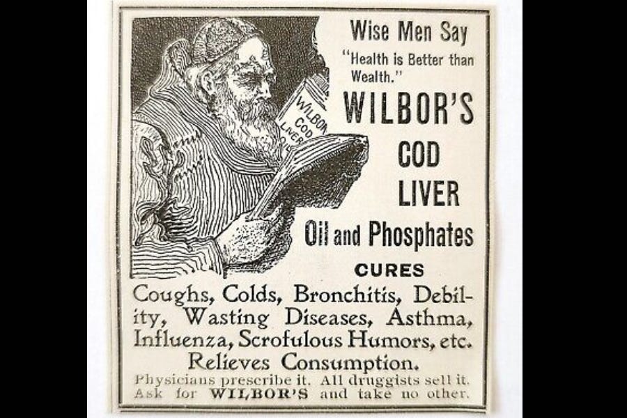 Whoa! Doesn’t he know cod liver oil causes milk leg, the blue screamers, and colly wobbles? Most leading quacks are recommending a course of leeches for everything and in extreme cases beating the demons of disease out.