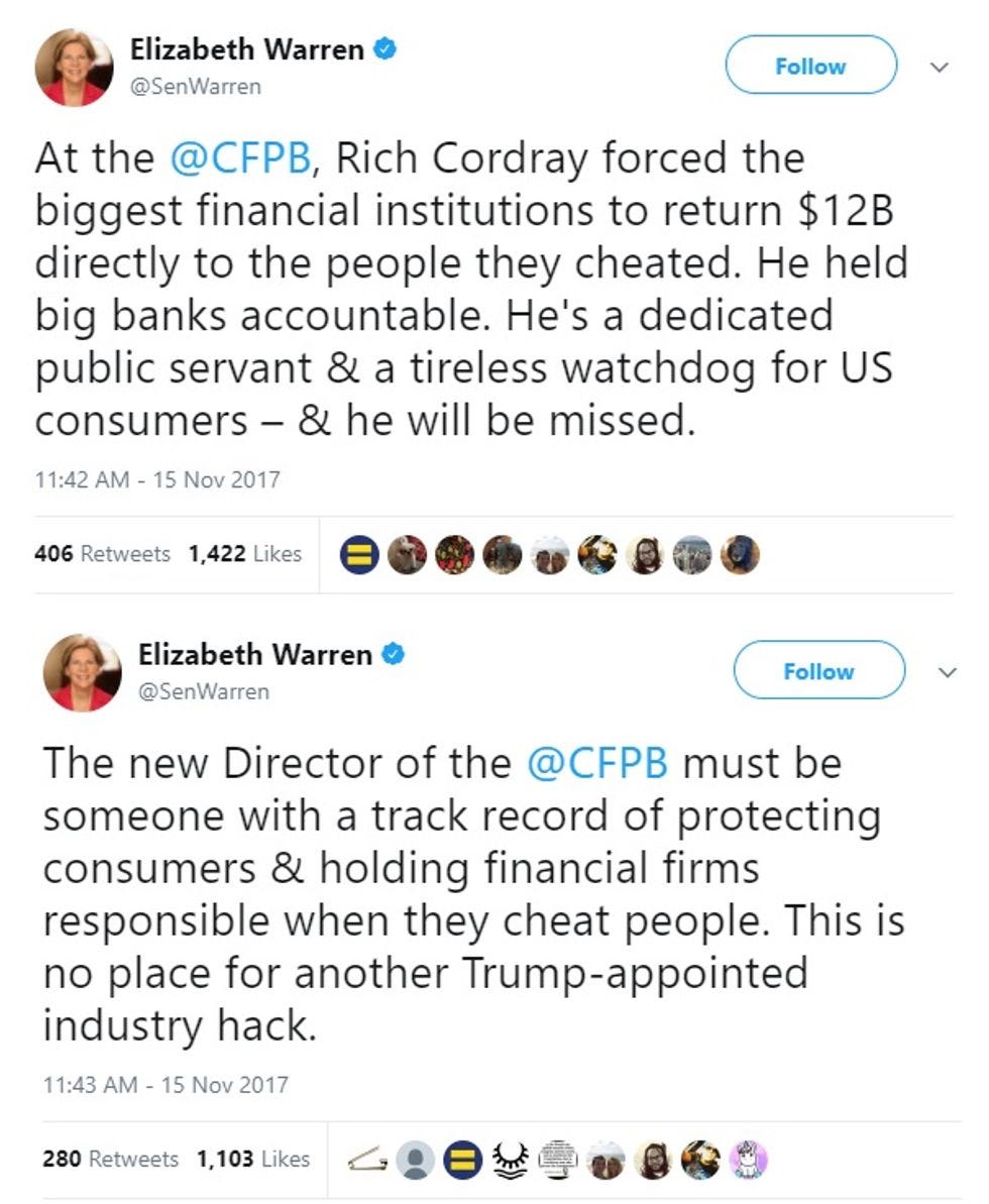 Elizabeth Warren, who crafted and drove the legislation that created the CFPB, pointed out that under Cordray's direction, the CFPB had done real good for consumers, and also offered a recommendation for what almost certainly won't happen: