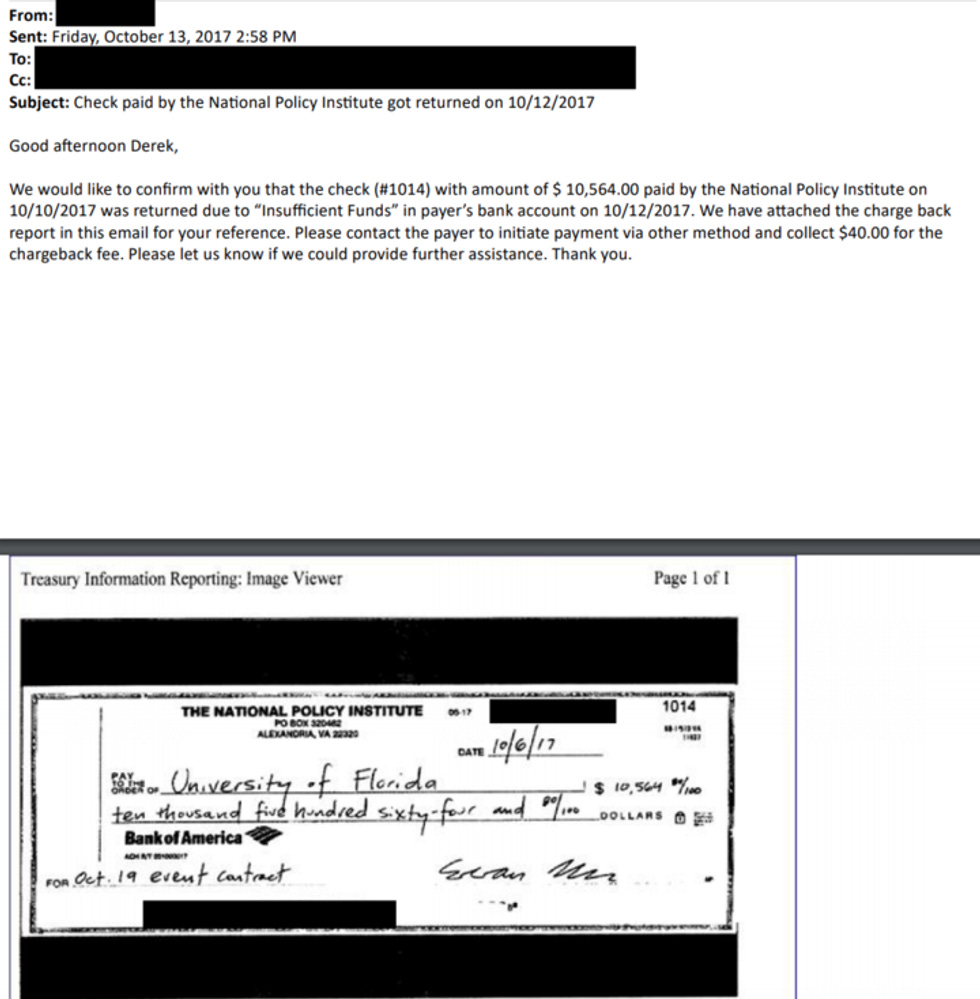The Huffington Post reports that, prior to Spencer's speaking engagement at the University of Florida, NPI was required to give the school a check for $10,564.80. And they did indeed send a check for that amount.