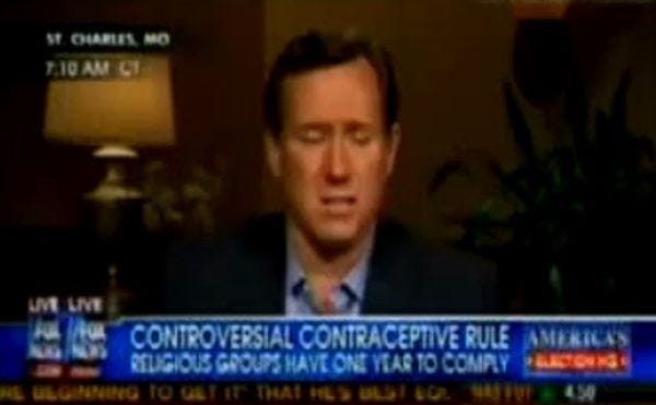 Cadaverous walking smirk Rick Santorum must still be high on endorphins from Tuesday's surprise threesome in some meaningless/game-changing voting things. Having seen how turgid the prospects of Abortionplexes and FEMA-officiated gay marriage have been making conservative voters of late, Santorum is preparing a new front in the Culture Wars that, incidentally, also feed and shod his family. So, uh, down with Barack Obama and his quest to force Catholics to ordain lady priests like a bunch of common Episcopalians!