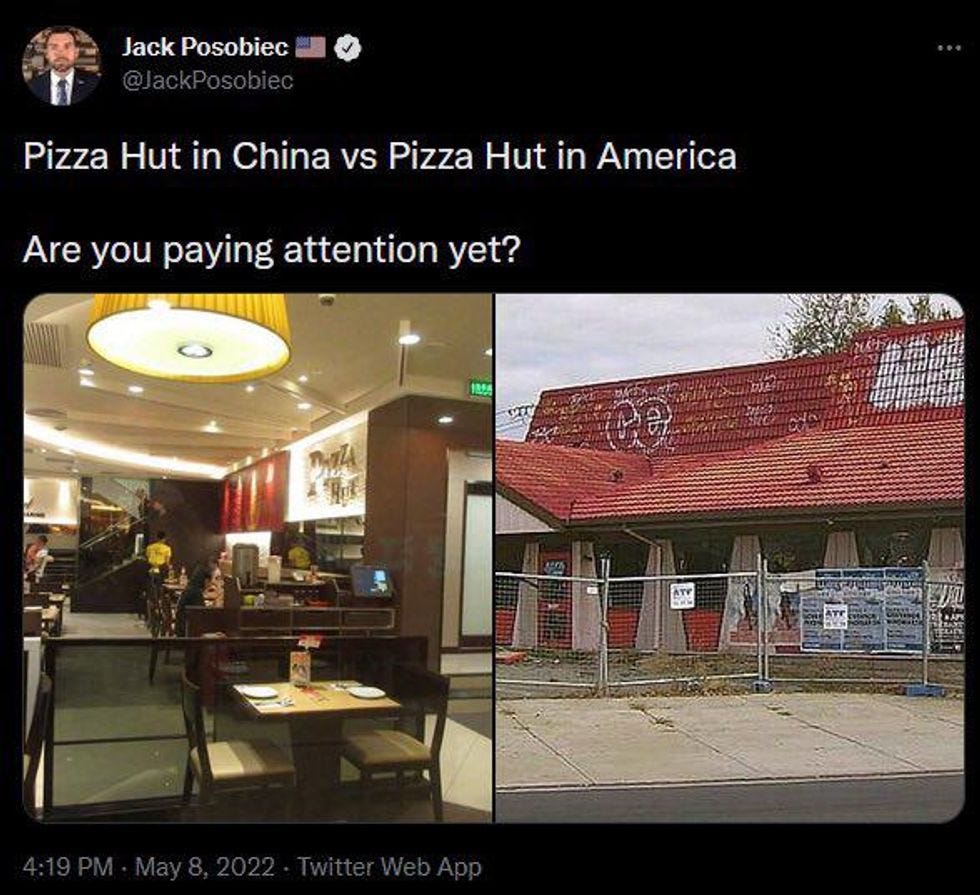 Posobiec has a long-standing beef with the pizza chain, having previously tweeted out a picture of what he claimed was a "Pizza Hut in China vs. Pizza Hut in America" along with the caption "Are you paying attention yet?"