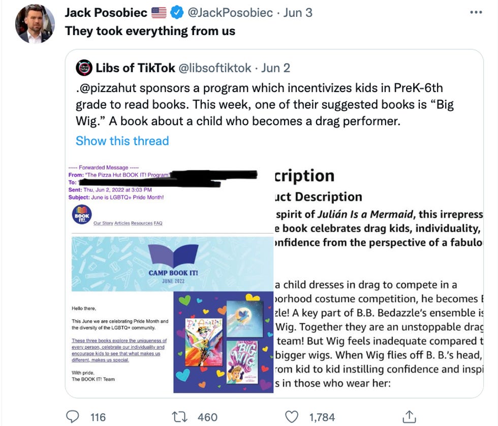 Now, this is not really about "the children." These people know that no one is forcing their children to read this book or to get up on a stage and lip sync to "If I Could Turn Back Time," they know that they can't force other parents to raise their kids to be bigots, they just don't like being left behind. They don't like the fact that yeah, it is totally normal now to have a children's book about drag queens be recommended by a national pizza chain — because drag queens and pizza are awesome and Jack Posobiec and Brigitte Gabriel suck .