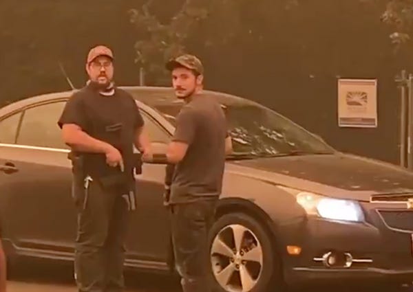 In what appears to be a response to these rumors, a bunch of armed rightwing militia types have set up their very own checkpoints for the purpose of interrogating people they think might be "Antifa," at gunpoint. Journalists Sergio Olmos, Justin Yau, and Alisa Azar were traveling together to document the fires when all three were accosted by a few of these lunatics and told to get the fuck out, lest they start any forest fires.