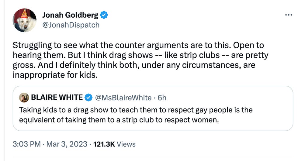 Conservative columnist Jonah Goldberg responded to White's tweet as if she'd made some profound insight. He wrote, "Struggling to see what the counter arguments are to this. Open to hearing them. But I think drag shows — like strip clubs — are pretty gross. And I definitely think both, under any circumstances, are inappropriate for kids."
