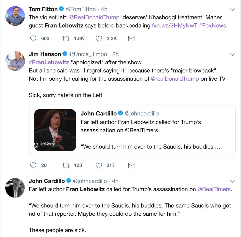 Bill Maher and Fran Lebowitz were talking about whether or not Trump should be impeached. Lebowitz says "That would be just the beginning of what he deserves" and then goes on to suggest that we give him "over to the Saudis, his buddies – the same Saudis who got rid of that reporter." Then she pauses and says "Maybe they could do the same for him."