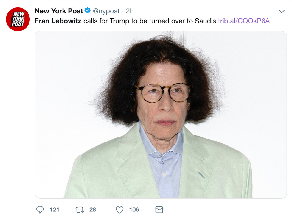 It should not have been a big deal, especially because the people most upset about this are the people who were fine with what happened to Jamal Kashoggi. It also should not be a big deal, because it is Fran Lebowitz, a woman known for writing things like: