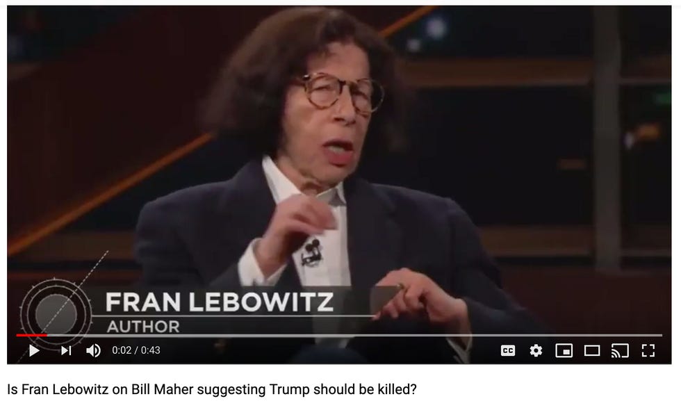 This morning the internet awoke to find Fran Lebowitz, of all people, trending on Twitter. Not gonna lie, my heart stopped for a moment, and Twitter really needs to start putting "NOT DEAD" beneath people's names when they trend. As it turns out, the reason for this beautiful living saint trending on Twitter was because she said a THING on Bill Maher last night and the right is really, really upset about it and they are all sobbing their faces off on the Twitter about how Fran Lebowitz, a person they have never heard of because they're just not that well read as a people, wants their beloved president to be murdered .