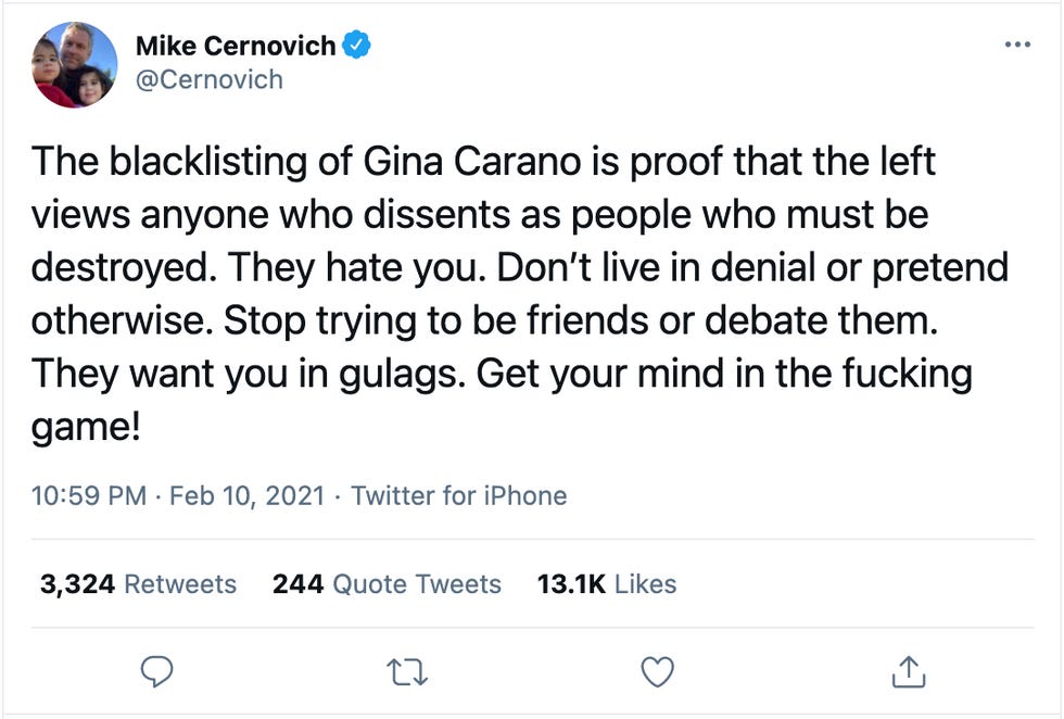 The blacklisting of Gina Carano is proof that the left views anyone who dissents as people who must be destroyed. They hate you. Don't live in denial or pretend otherwise. Stop trying to be friends or debate them. They want you in gulags. Get your mind in the fucking game!