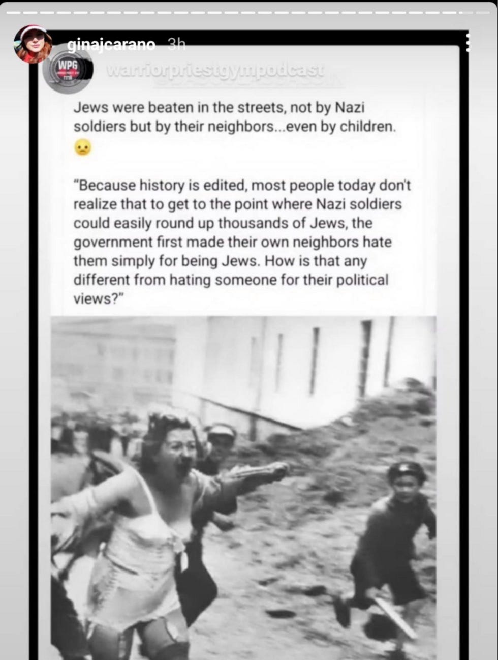Gina Carano compared Republicans to Jewish people in Nazi Germany on Instagram.