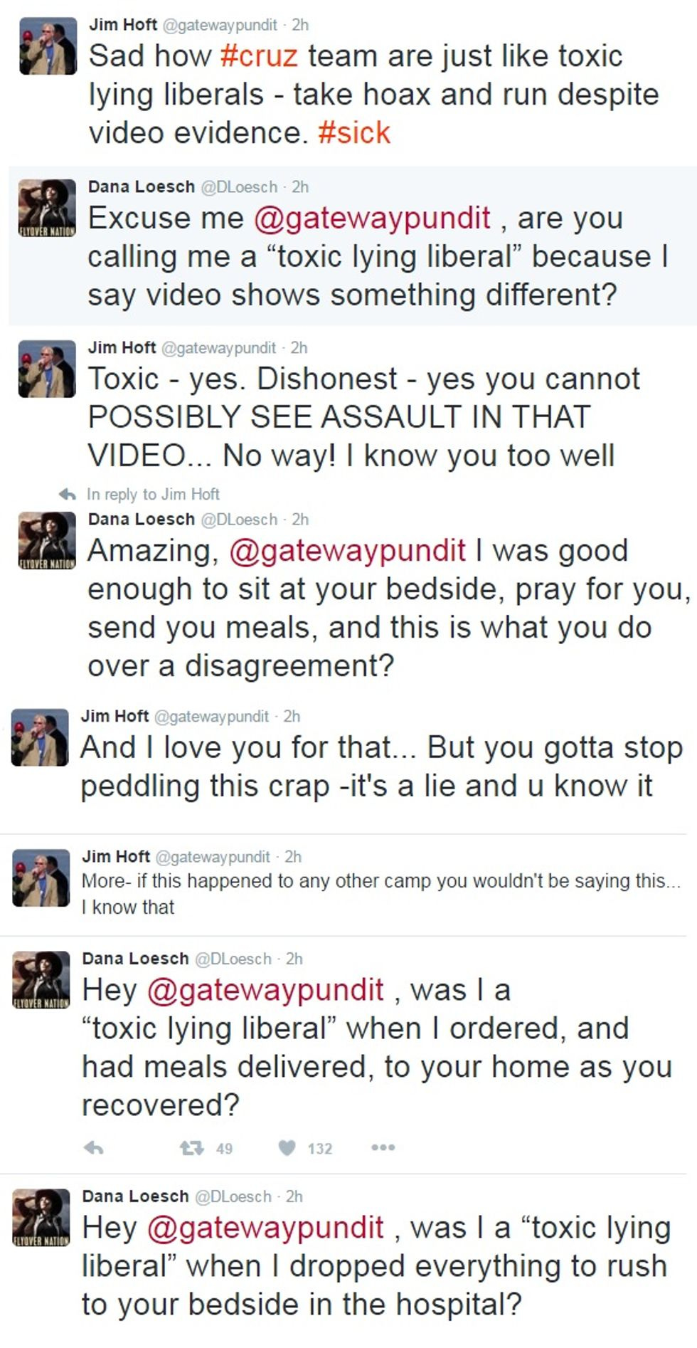 Ah, but then he went a step too far, and accused anyone dumb enough to think they saw any kind of assault of being just as bad as liberals! This was the last straw for Loesch, who reminded Hoft that she had prayed for him and helped him when he was seriously ill in 2013 (and we are very glad he recovered, even if he is a lying hack):