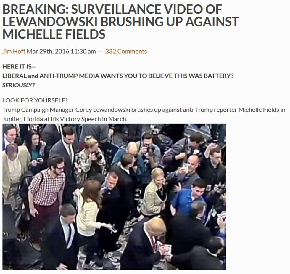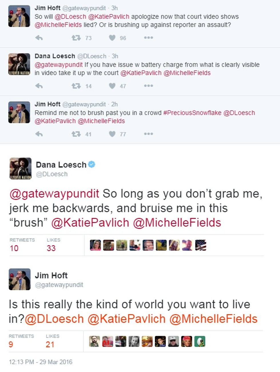 Elections can be so stressful on friendships. One friend supports Candidate A, while the other supports Candidate Shithead, and before you know it, they start letting their political disagreements come between them. It's very sad, and if you think the acrimony between supporters of Bernie and Hillary in the Wonkette comments (which are not allowed) gets ugly sometimes, you should see how rightwingers get in a primary campaign spat. Take, for instance, the spat between Good Christians and congenital rightwing liars Dana Loesch and Jim Hoft, whose friendship very publicly asploded all over Twitter Tuesday as the two argued over the arrest of Donald Trump's campaign manager and chief lickspittle Corey Lewandowski, for simple battery of former Breitbart Girl Reporter Michelle Fields. Gun-toting rage-harpy Loesch supports Ted Cruz, you see, and thinks security video released by police Tuesday shows Lewandowski grabbing Fields by the arm. Stupidest Man on the Internet Jim Hoft is in the tank for Trump, and knows for an absolute fact that at most the video shows Lewandowski barely "brushed up" against Fields, who is a lying liar bent on destroying Donald Trump. Or as Hoft put it: