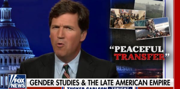 During his Monday night white power hour, Carlson blamed the very gains we just mentioned for Afghanistan's eventual fall. Americans should've realized that women don't know nothing.