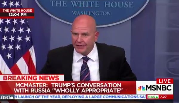 McMaster: "The President wasn't even aware of where this information came from. He wasn't briefed on the source and method." (via @MSNBC ) pic.twitter.com/7o5tkqkFVf