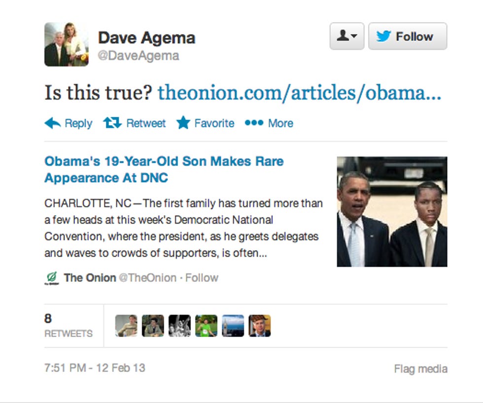 Cynics might argue that Dave Agema is a disingenuous piece of shit who was happy to exploit actual satire to gin up his far-right crazytown base of bigots and conspiracy theorists by playing on disparaging stereotypes about African-American males, or that it was only after someone noticed that he went "derp derp satire." That would be unfair. It's not like Dave Agema, a man who says (despite all objective evidence to the contrary) Obama must be a secret Muslim, would ever traffic is such vulgar misinformation to appeal to the body politic's lowest common denominator.