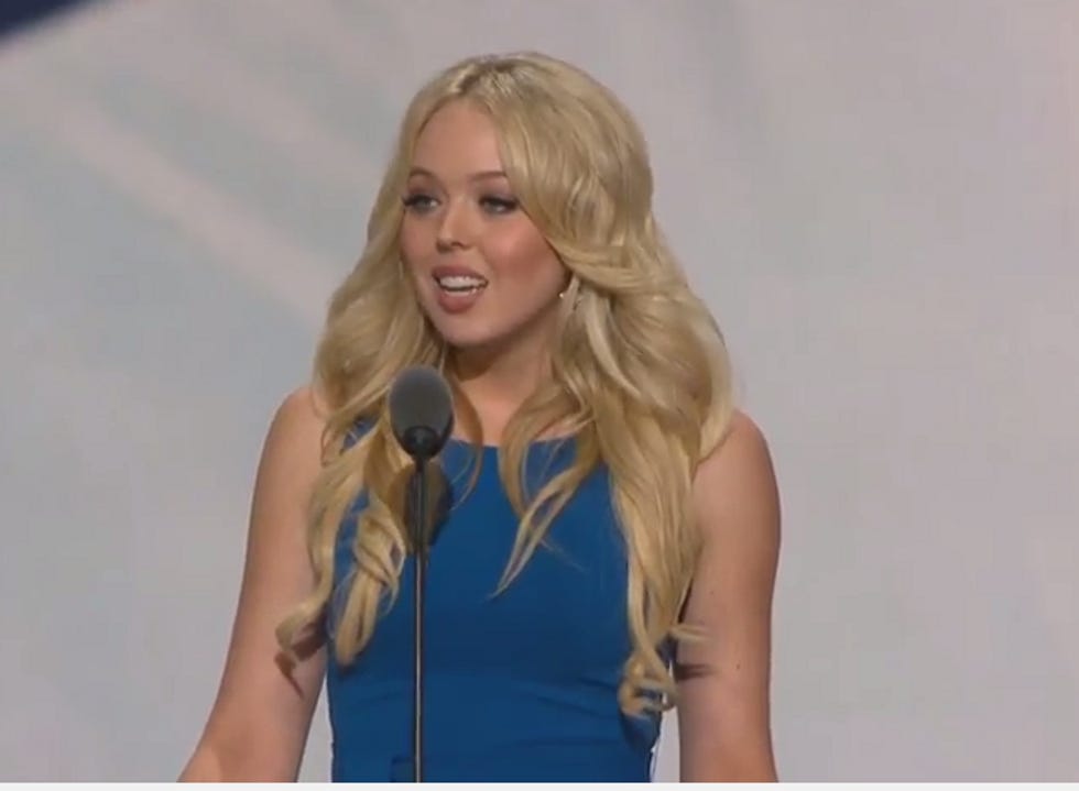 9: 53 p.m.: Tiffany Trump is up -- Donald's daughter with Marla Maples, whom he cheated on Ivana with,and on whom he cheated with Melania. (Sorry, I was thinking of the multiple wives of Newt Gingrich!) At first I was annoyed with her mugging for the cameras, but it's okay, she's fine. She is better at talking than her stepmother, and probably will make some millionaire a very nice third wife.