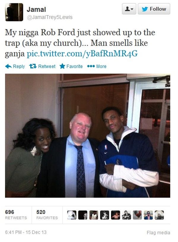 So there you have it: Rob Ford, pretty much stripped of mayoral authority by the city council but still "in office," visiting churches and smelling (allegedly) like ganja. The man is a gift that just keeps on giving. So it turns out Santa is white after all.