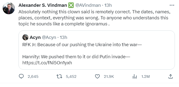 Kennedy just babbled out conspiracy theories somebody has syringed into his brain, for instance claiming State Department official Victoria Nuland ordered Zelenskyy not to make peace with Russia. (She was a private citizen at the time Kennedy cited.) Nuland factors into a lot of pro-Russia conspiracy theories, and plays a starring role in the one about secret Ukraine/US biolabs. Guess which other dumb shit believes in that one.