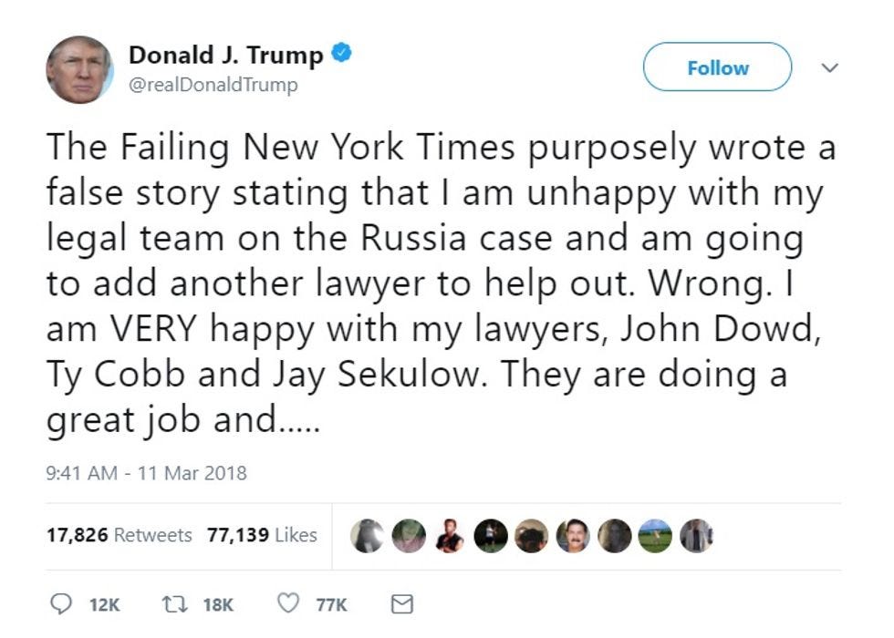 Though the president is a very stupid man with a bad brain, one more news bite from this weekend suggests he knows on some level that shit is getting real in the investigation. Maggie Haberman reports at the New York Times that Trump met with Emmet Flood, the lawyer who helped Bill Clinton through getting impeached by the House because he lied about a cum stain on a blue dress, possibly in hopes of adding Flood to his team. Haberman says Flood wouldn't necessarily replace head Trump idiot lawyer Ty Cobb, but that Cobb's job was to handle the document requests, and that part is just about over, so maybe he will quit destroying his professional career by representing Trump pretty soon.