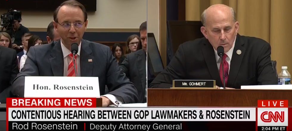 We commend Rod Rosenstein for not absolutely losing his shit today, and for being so gentle with Louie Gohmert. If we were in Rosenstein's position, we probably would have just pointed and laughed.