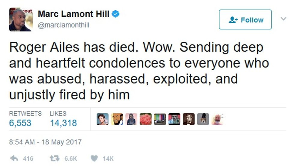 Ailes's pathological obsession with treating women as playthings finally crashed up against an era that was no longer 1960, and a raft of sexual harassment lawsuits got him fired -- very comfortably, but fired all the same. This year, the work environment Ailes encouraged led to the firing of Bill O'Reilly, and then co-president Bill Shine, and the network still seems like a dubious place for women to want to work. And now the Murdoch family will have to find a way to keep making billions, somehow. They'll probably be OK. Condolences to Ailes's family, yes, but we're also in complete agreement with Temple University professor and media commentator Marc Lamont Hill:
