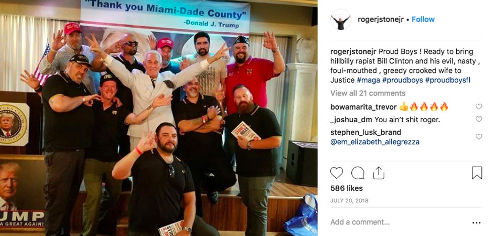 That argument fell flat with Her Honor, who expanded the gag order on Stone. She also ordered to him to give up the names of his volunteer social media "managers" on the stand. As BuzzFeed pointed out, Stone's four named assistants, Enrique Tarrio, Tyler Whyte, Jacob Engels, and Rey Perez, are all associated with Florida's Proud Boys, the racist, nationalist gang whose members were arrested in New York this fall for for beating up peaceful anti-fascist demonstrators. Here's Roger hanging with his Proud posse, most of whom are flashing the white power "okay" sign.